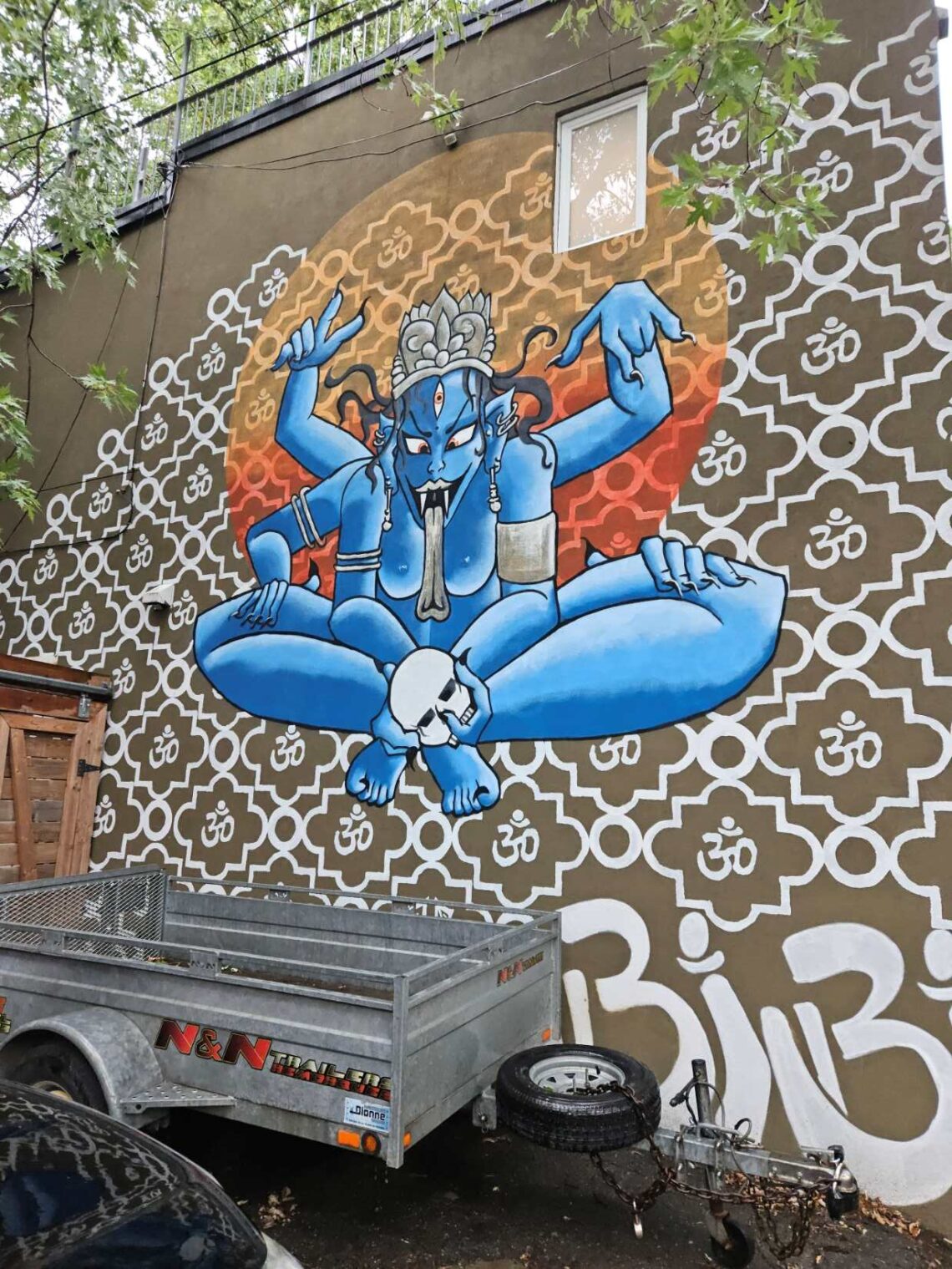 Déesse à 4 mains Murales de Montréal Cette fresque est sur le mur d’un parking extérieur. Cette déesse à 4 mains et 4 pieds est, j’imagine, indienne. Elle tient un crane dans deux de ses pieds Pour la trouver